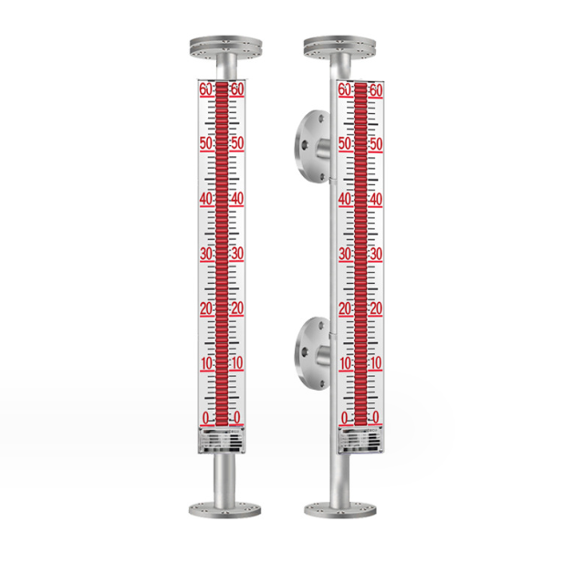 UHZ/C系列磁翻柱液位计根据浮力和磁耦合原理,测量筒内磁性浮子随被测液面的升高(降低)驱动测量筒外部显示器上的双色翻柱旋转180℃显示红色(反向旋转180℃显示白色)实现了测量和显示被测液面位置的目的。具体解释就是:UHZ/C系列磁翻柱液位计它有一容纳浮球的腔体我们称其为主体管或外壳,它通过法兰或其他接口与容器组成一个连通器;这样它腔体内的液面与容器内的液面是相同高度的,所以腔体内的浮球会随着容器内液面的升降而升降;这时候我们并不能看到液位,所以我们在腔体的外面装了一个翻柱显示器,因为我们在制造浮球时在浮球沉入液体与浮出部分的交界处安装了磁钢,它与浮球随液面升降时,它的磁性透过外壳传递给翻柱显示器,推动磁翻柱翻转180°;由于磁翻柱是有红、白两个半圆柱合成的圆柱体,所以翻转180°后朝向翻柱显示器外的会改变颜色(液面以下红色、以上白色),两色交界处即是液面的高度。每个磁翻柱双色轴向对称结构,两个磁翻柱间的间距为10mm或20mm,分别以白色和红色来指示气相部分和液相部分,也可选择下部白色表示液体部分上部红色表示气体部分。红色与白色交接处就是液相与气相的分界处。该液位计也能用于两种不同密度介质的界面测量。